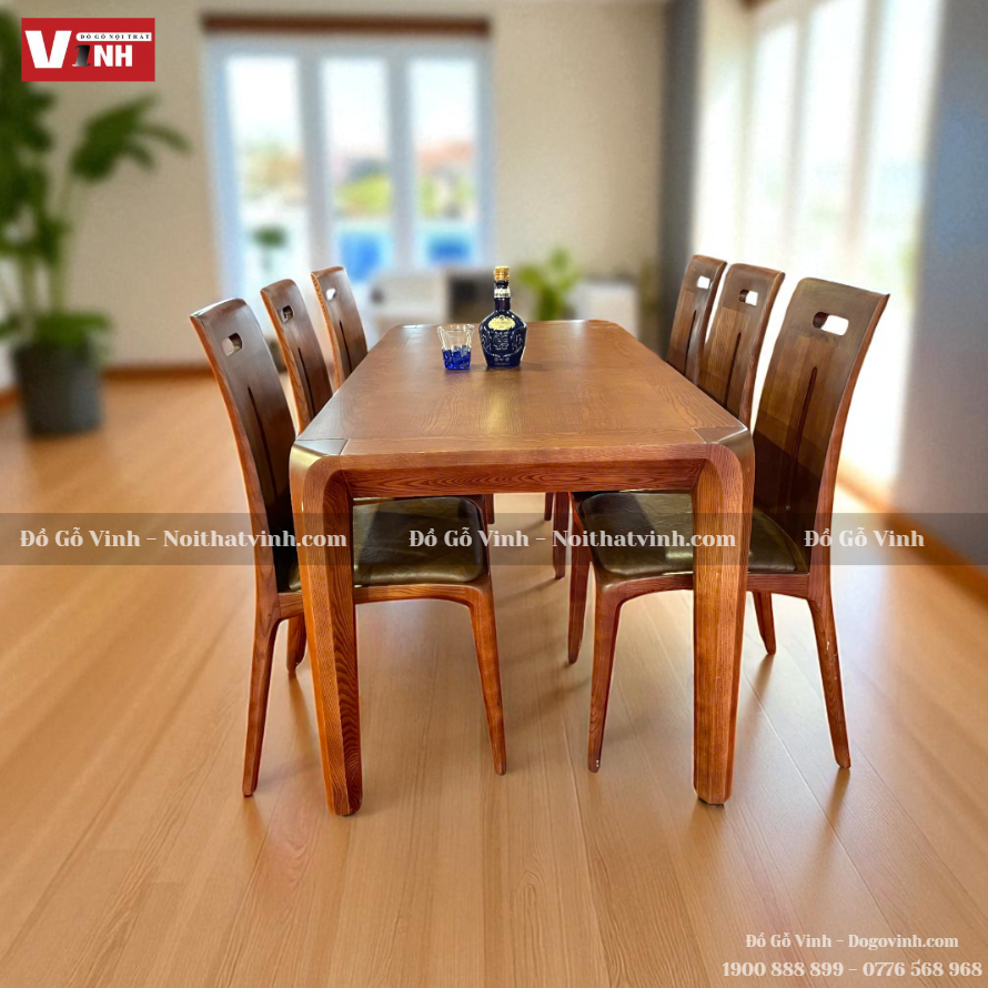 Bộ bàn ăn HCN kết hợp 6 ghế lưng cao bọc nệm gỗ Tần Bì mang đến không gian ấm cúng và tinh tế cho gia đình.