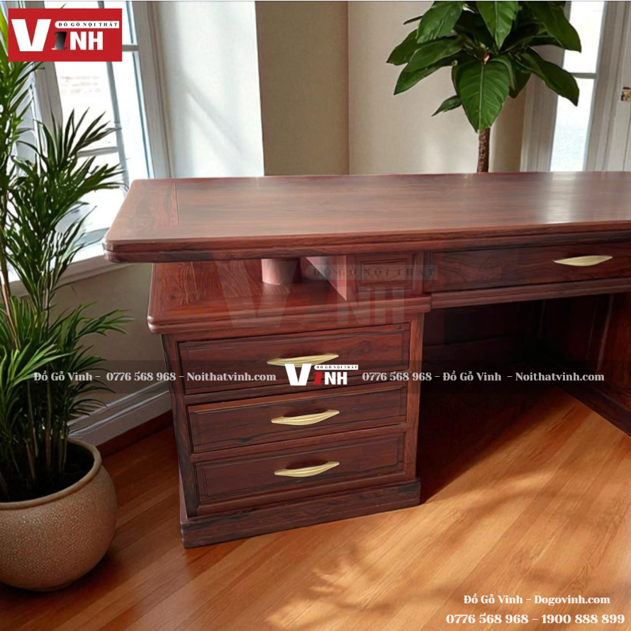 Mẫu bàn giám đốc 2m32 tại Đồ Gỗ Nội Thất Vinh là sản phẩm sang trọng dành riêng cho không gian làm việc cao cấp. Sản phẩm được chế tác từ gỗ cẩm lai quý hiếm, nổi bật với vân gỗ uyển chuyển, màu sắc sang trọng và độ bền vượt thời gian.
