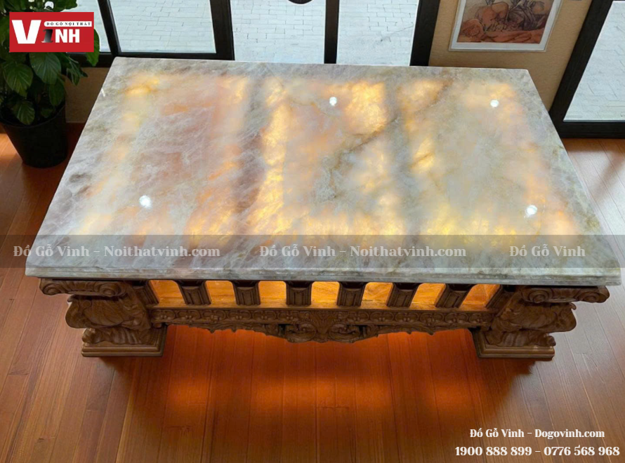 Mặt bàn sử dụng đá thạch anh tự nhiên nguyên khối, với bề mặt bóng mịn, khả năng chịu lực tốt và chống trầy xước hiệu quả. Khi kết hợp cùng phần khung gỗ, tạo nên tổng thể chắc chắn, bền bỉ và vô cùng đẳng cấp.