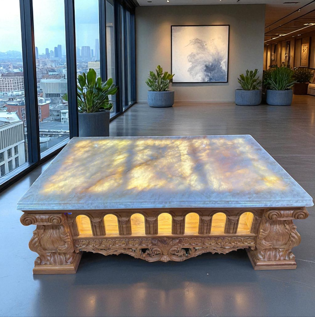 Điểm nhấn đặc biệt chính là hệ thống các ô gỗ ở phần khung bàn, được thiết kế để lắp kính – khi bật đèn sẽ tạo nên một không gian lung linh, sống động, khiến mọi ánh nhìn đều bị thu hút.
