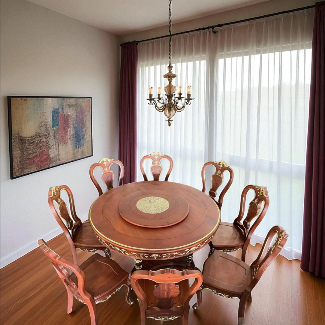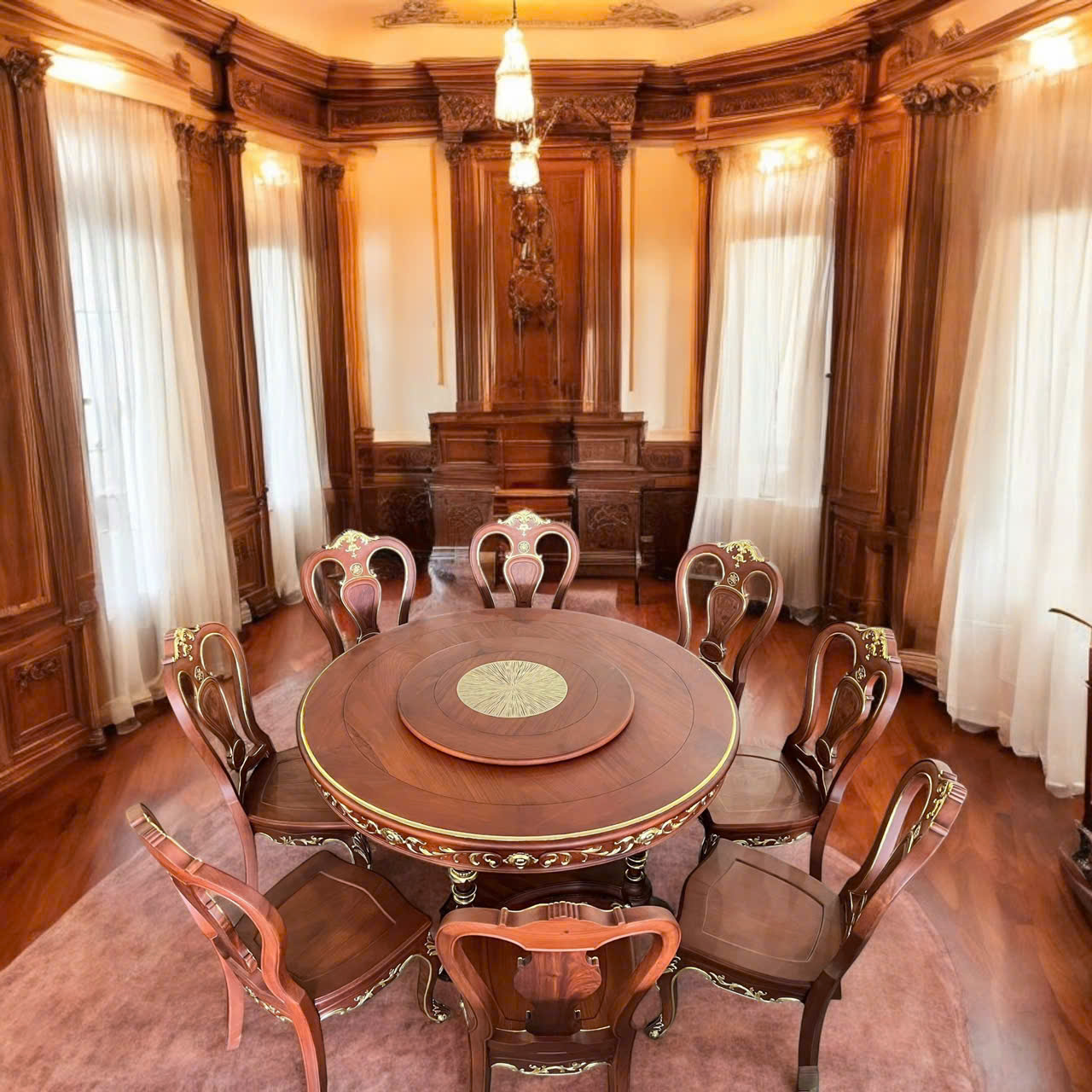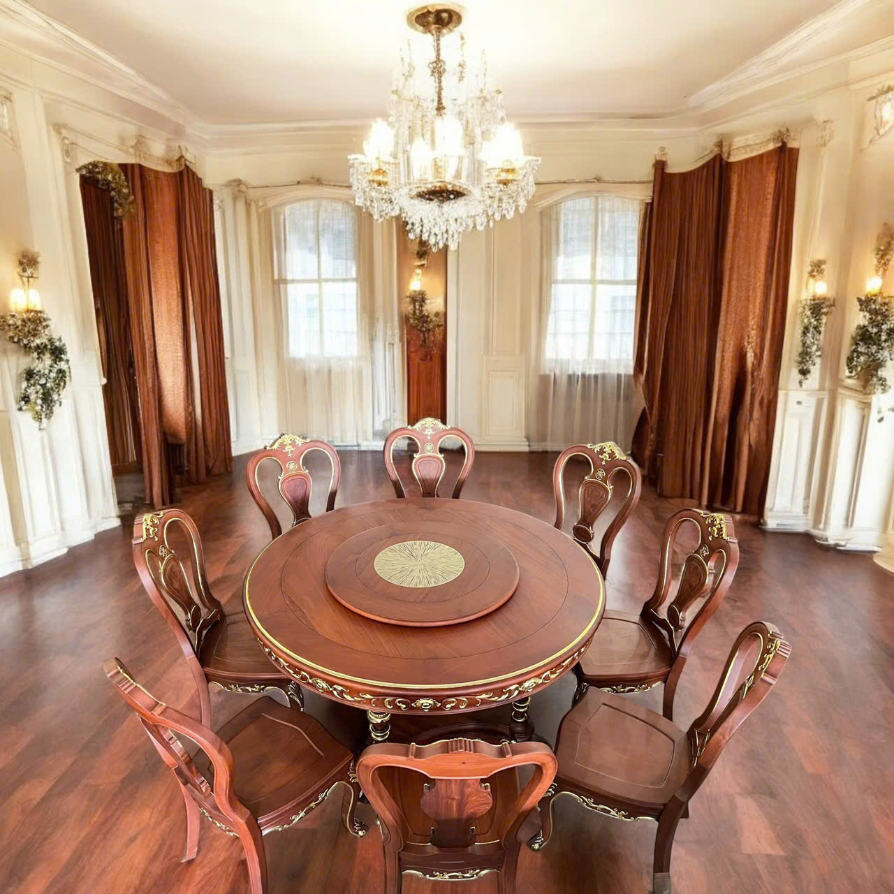 ✅ Điểm nổi bật của bàn tròn mâm xoay gõ đỏ là phần mặt bàn tròn kết hợp với mâm xoay linh hoạt ở giữa, tiện lợi trong các bữa cơm gia đình, buổi tiếp khách hoặc bàn tiệc đông người. Thiết kế tròn mang ý nghĩa đoàn viên, tạo cảm giác gần gũi, ấm cúng cho không gian nội thất.