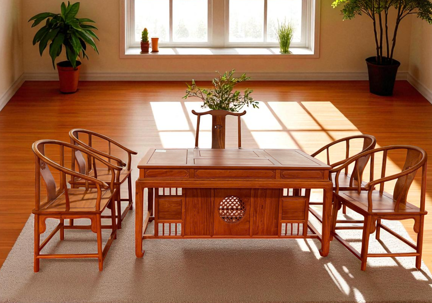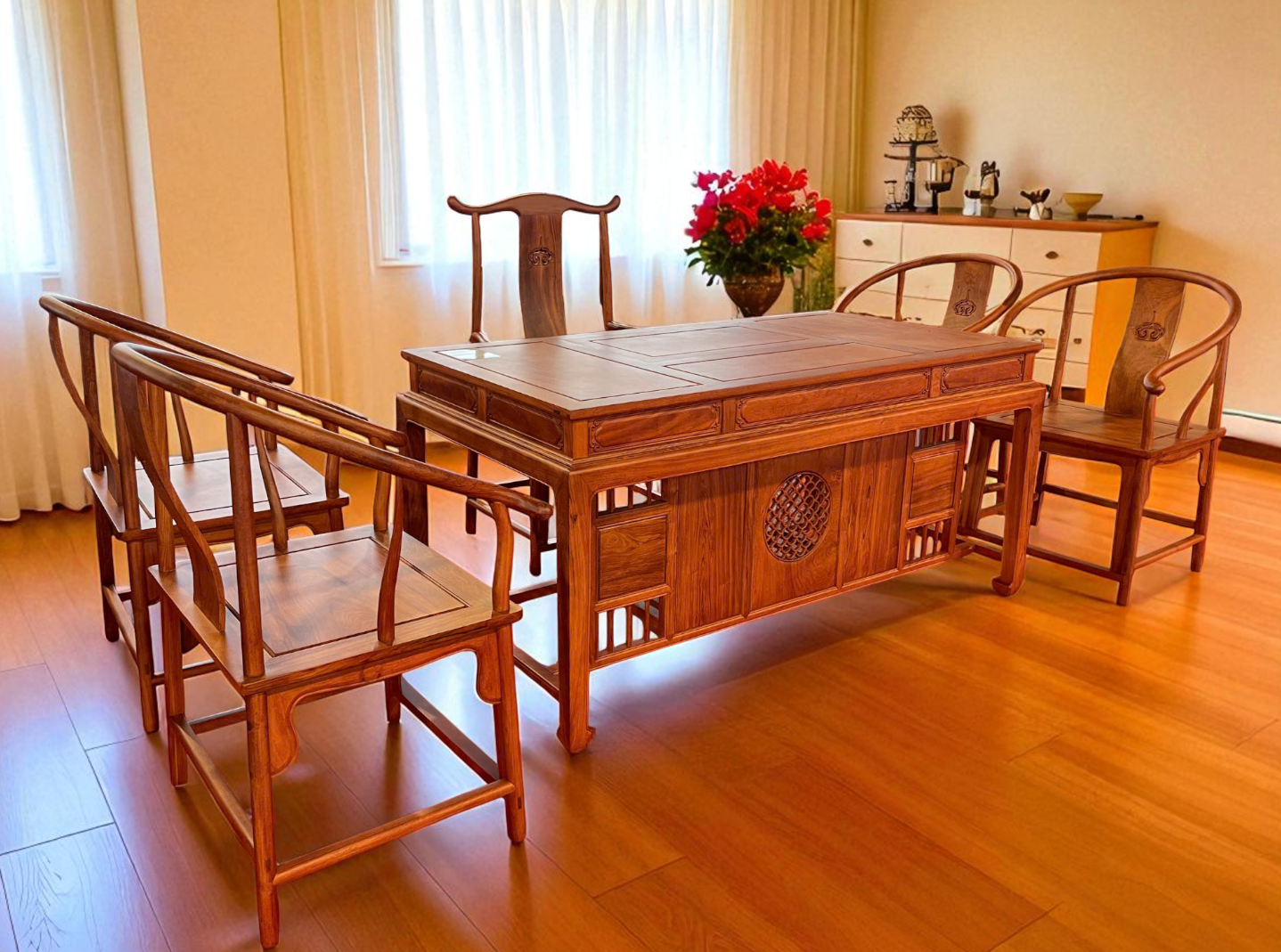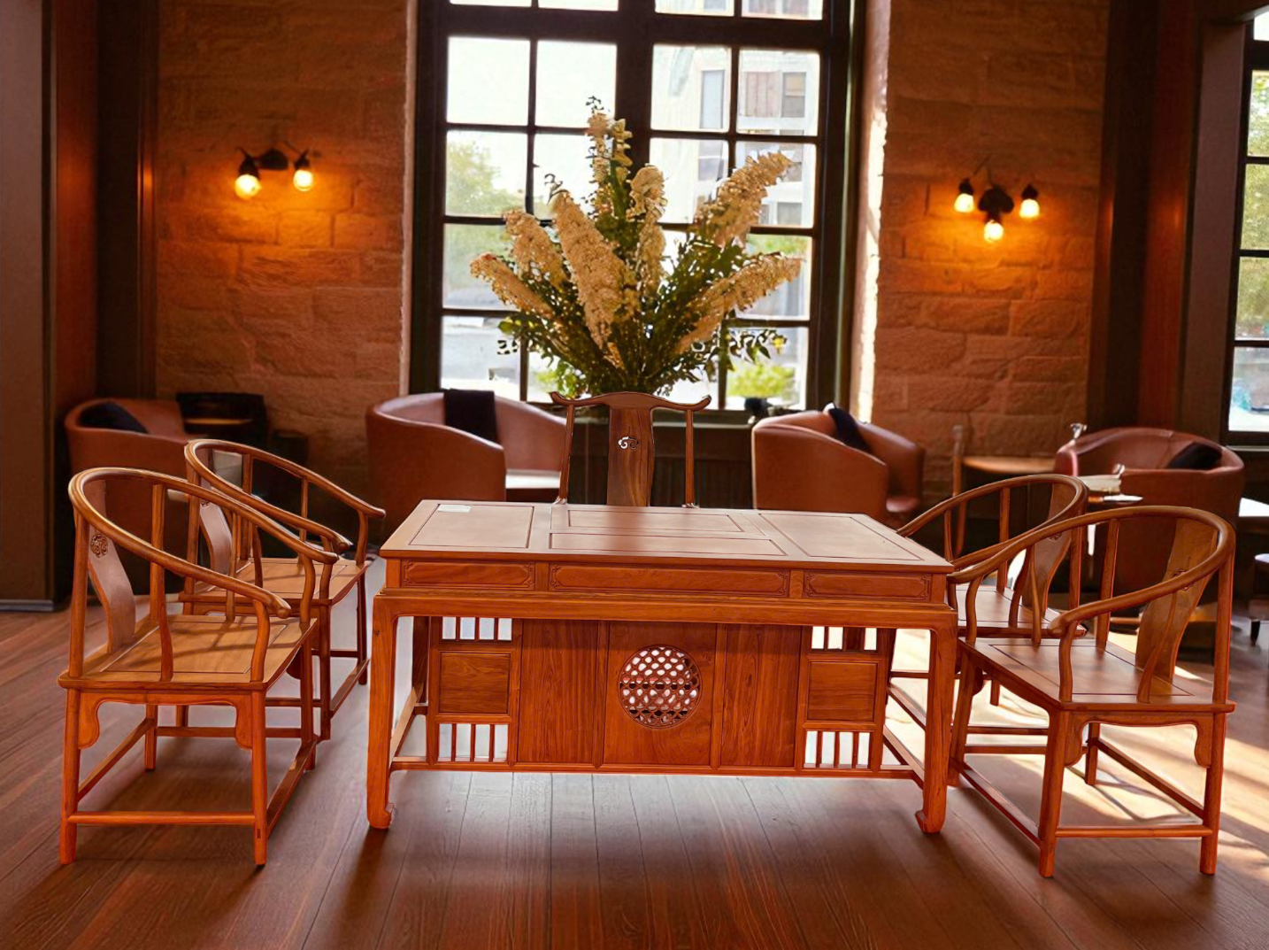 Bộ sản phẩm gồm 1 bàn, 1 ghế chủ, 4 ghế phụ, phù hợp cho không gian tiếp khách hoặc thưởng trà tinh tế.
