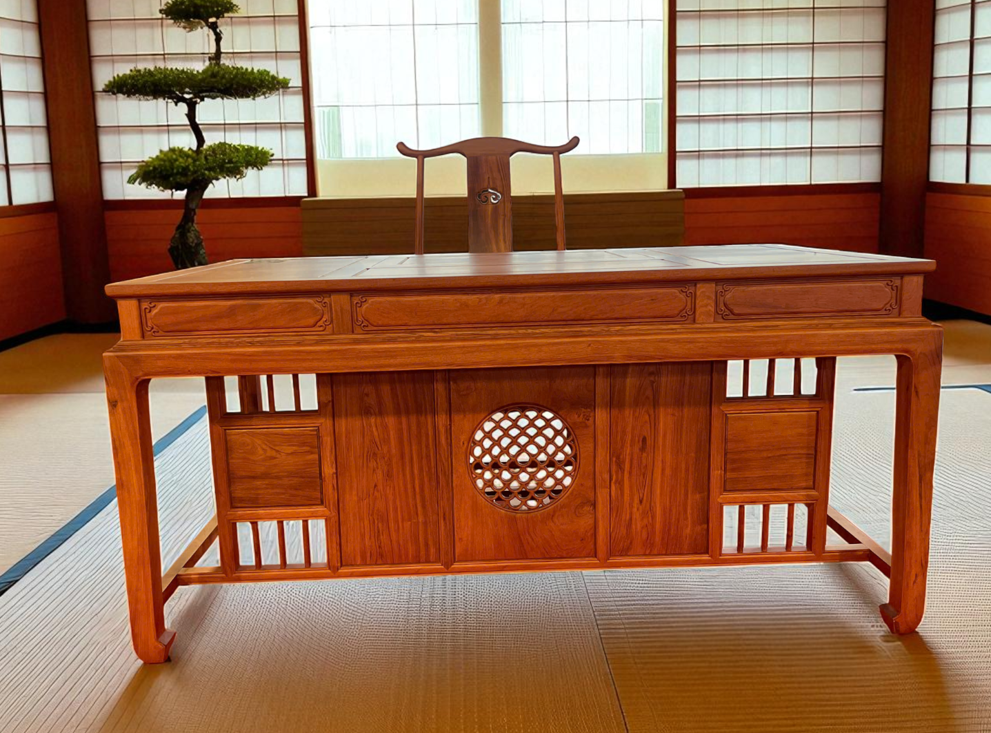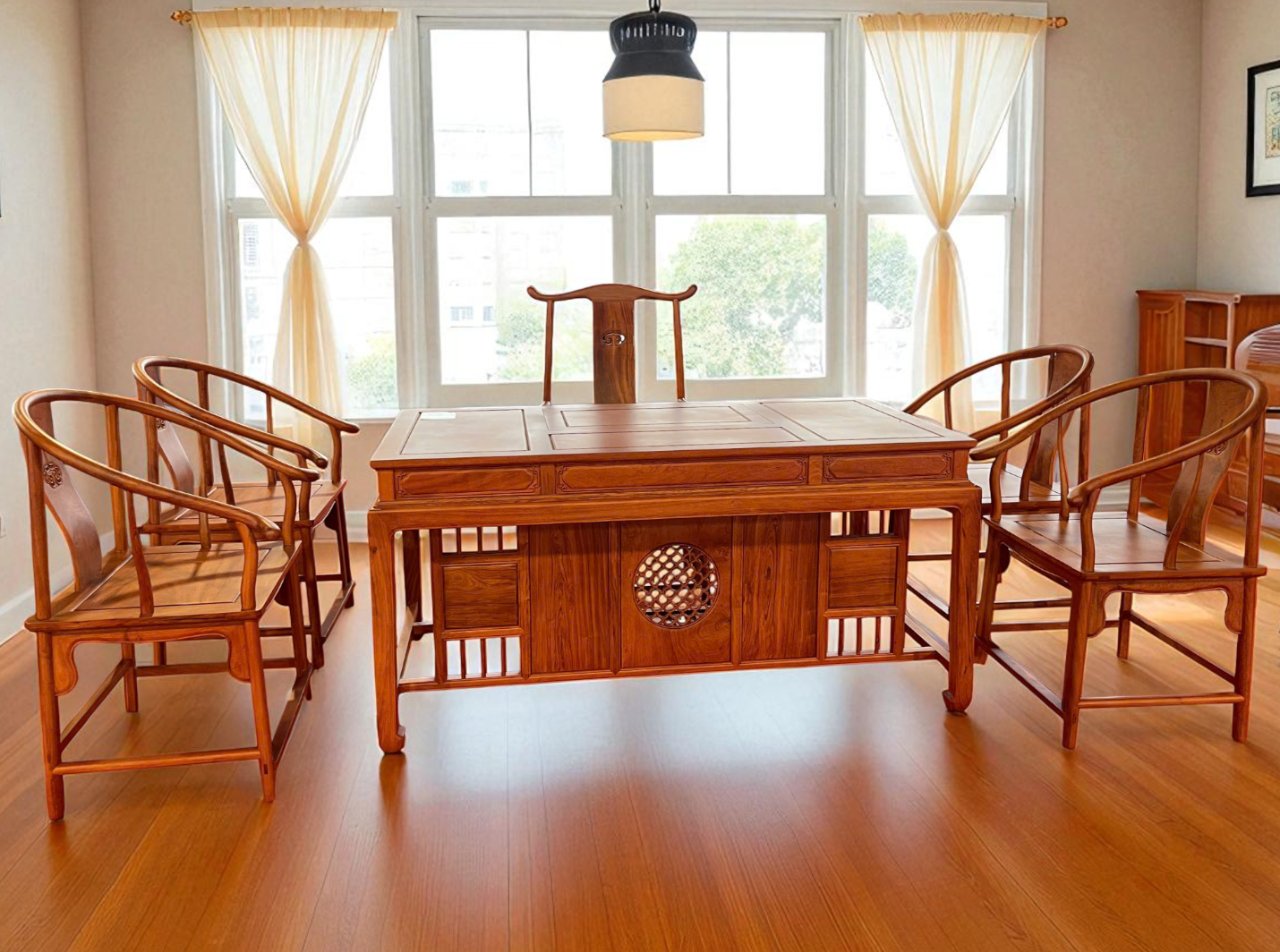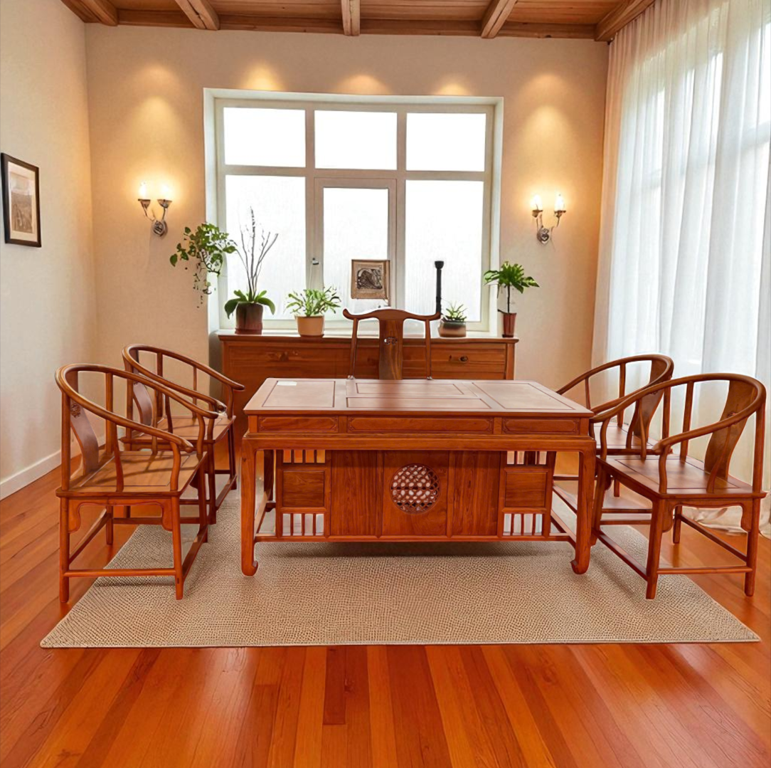 Bộ sản phẩm gồm 1 bàn, 1 ghế chủ, 4 ghế phụ, phù hợp cho không gian tiếp khách hoặc thưởng trà tinh tế.