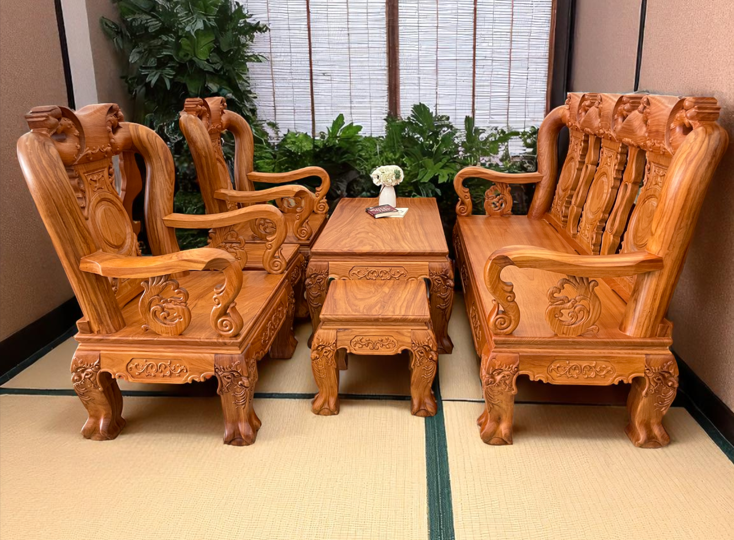 Bộ sản phẩm gồm 6 món: 1 băng dài, 2 ghế đơn, 1 bàn lớn, 1 bàn nhỏ và 1 đôn. Thiết kế hài hòa, chuẩn phong cách phòng khách cổ điển.