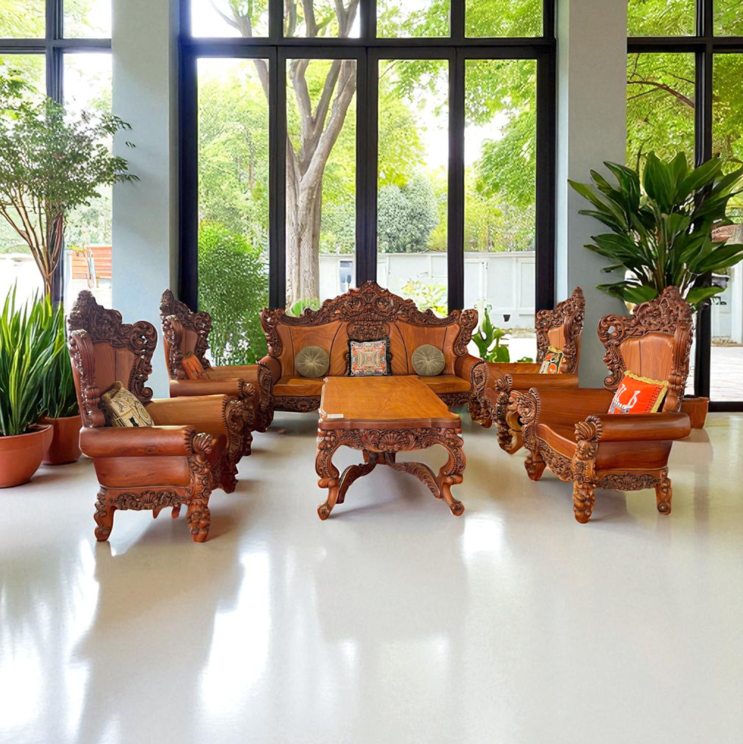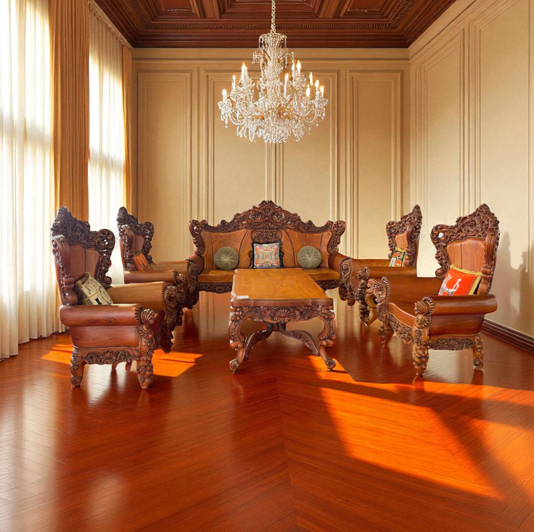 Bộ Hoàng Gia VIP được chế tác từ các loại gỗ quý tự nhiên, phủ sơn inchem cao cấp, kết hợp đệm da thật hoặc vải nhập khẩu Bỉ sang trọng. Thiết kế cầu kỳ, tinh xảo theo phong cách hoàng gia châu Âu, phù hợp với phòng khách biệt thự, nhà phố sang trọng.