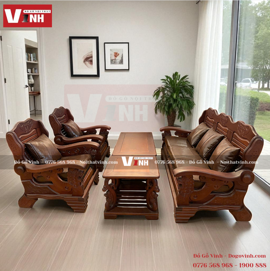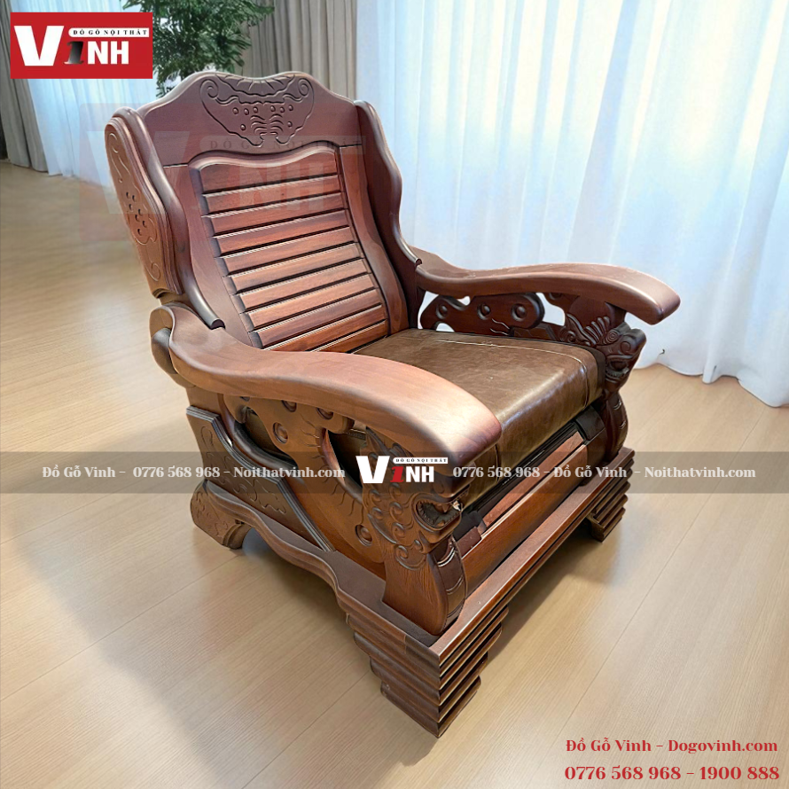 Bộ ghế lân 5 món từ gõ đỏ được chế tác bởi Đồ Gỗ Vinh, nổi bật với sự chắc chắn, độ bền cao và màu sắc sang trọng. Bề mặt gỗ được xử lý kỹ, sơn màu cẩm đẹp mắt, giúp sản phẩm giữ được giá trị thẩm mỹ lâu dài trong không gian phòng khách.