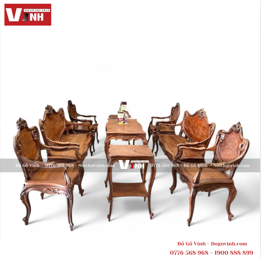 Bộ ghế Louis VIP 9 món gỗ Cẩm Lai là sản phẩm cao cấp tại Đồ Gỗ Vinh, nổi bật trong phân khúc nội thất Bình Dương nhờ thiết kế vương giả, chất liệu quý hiếm và kỹ thuật chạm trổ sắc sảo.