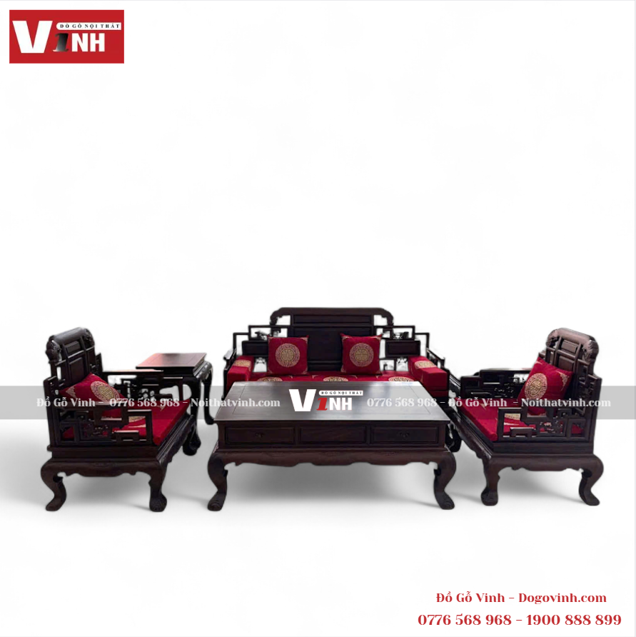 Sản phẩm bao gồm: 1 băng dài, 2 ghế đơn, 1 bàn lớn, 1 bàn kẹp và 1 đôn, giúp không gian phòng khách trở nên hài hòa, tiện nghi và sang trọng. Với kiểu dáng cân đối, bộ ghế dễ dàng kết hợp với các món *nội thất Bình Dương* khác, mang đến tổng thể không gian đẳng cấp và hiện đại.