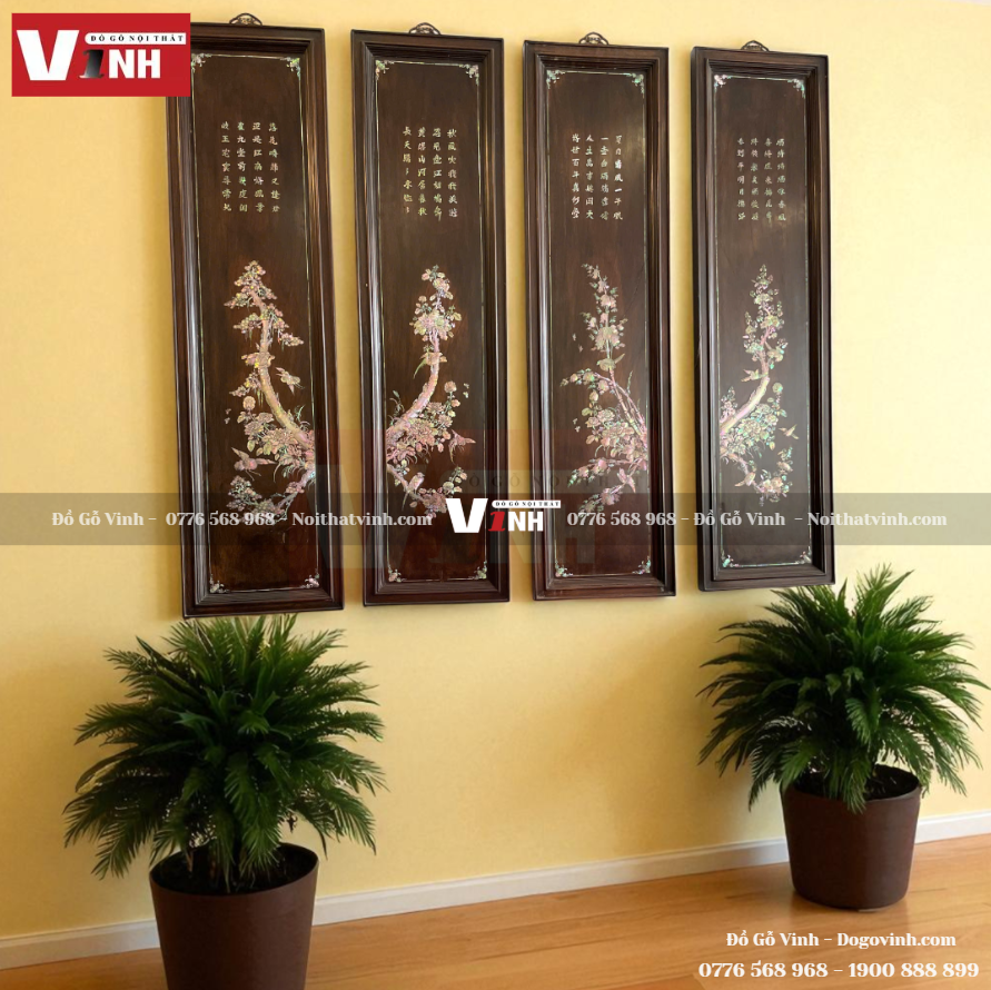 • Mỗi tấm tranh là sự kết hợp hài hòa giữa nền gỗ trắc trầm ấm và hoa văn cẩn ốc óng ánh.