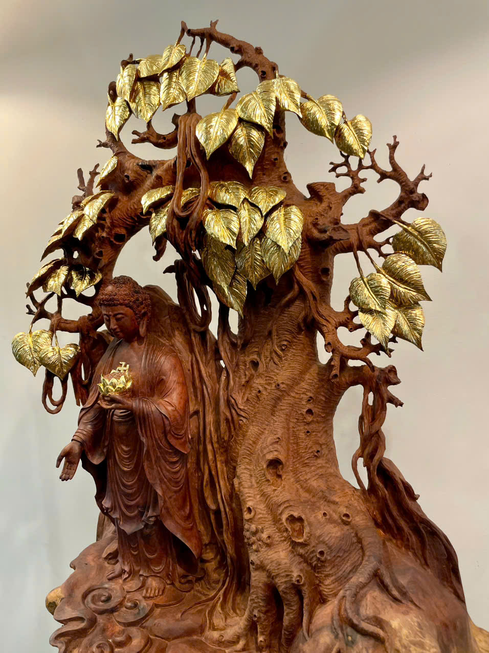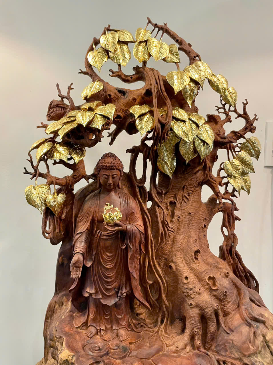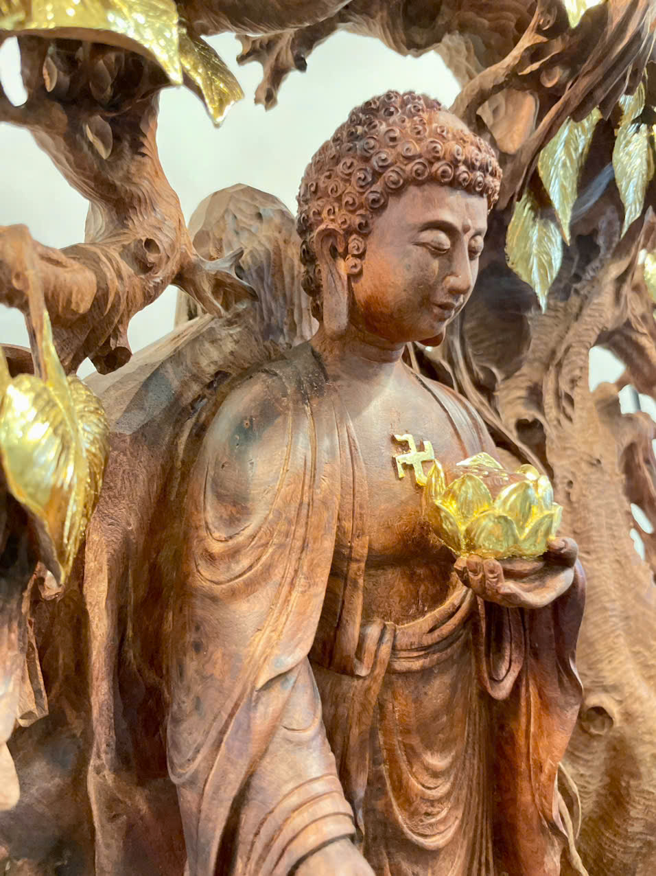 • Tượng Phật A Di Đà được chế tác hoàn toàn từ *nu hương Việt Nam* – dòng gỗ quý nổi bật với phần nu xoáy độc đáo, mỗi khối gỗ mang hình dáng và kết cấu riêng biệt không thể sao chép. Chính vì thế, mỗi tác phẩm là *độc bản duy nhất*.