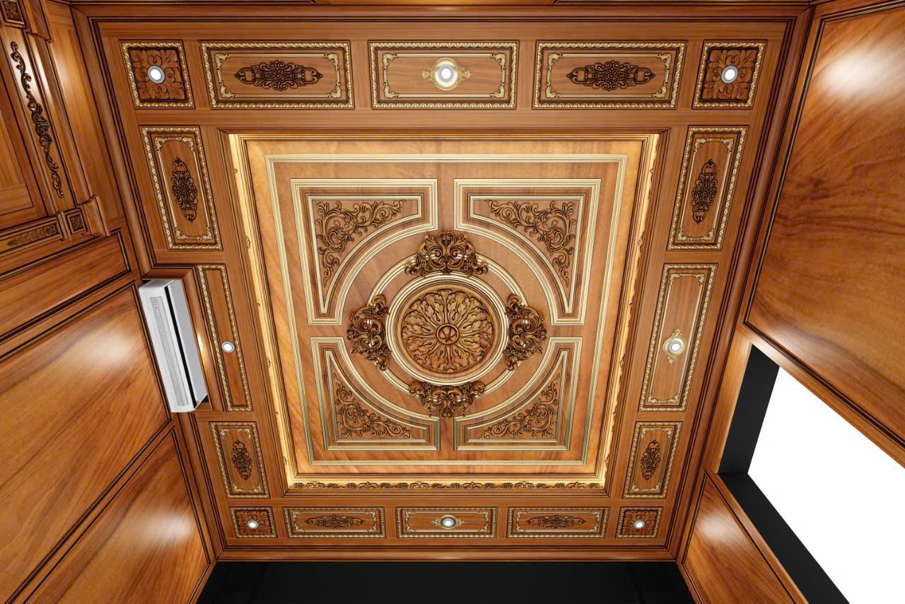 - Chất liệu gỗ tự nhiên cao cấp như gỗ gõ đỏ, gỗ hương, gỗ cẩm lai giúp trần có độ bền vượt thời gian.