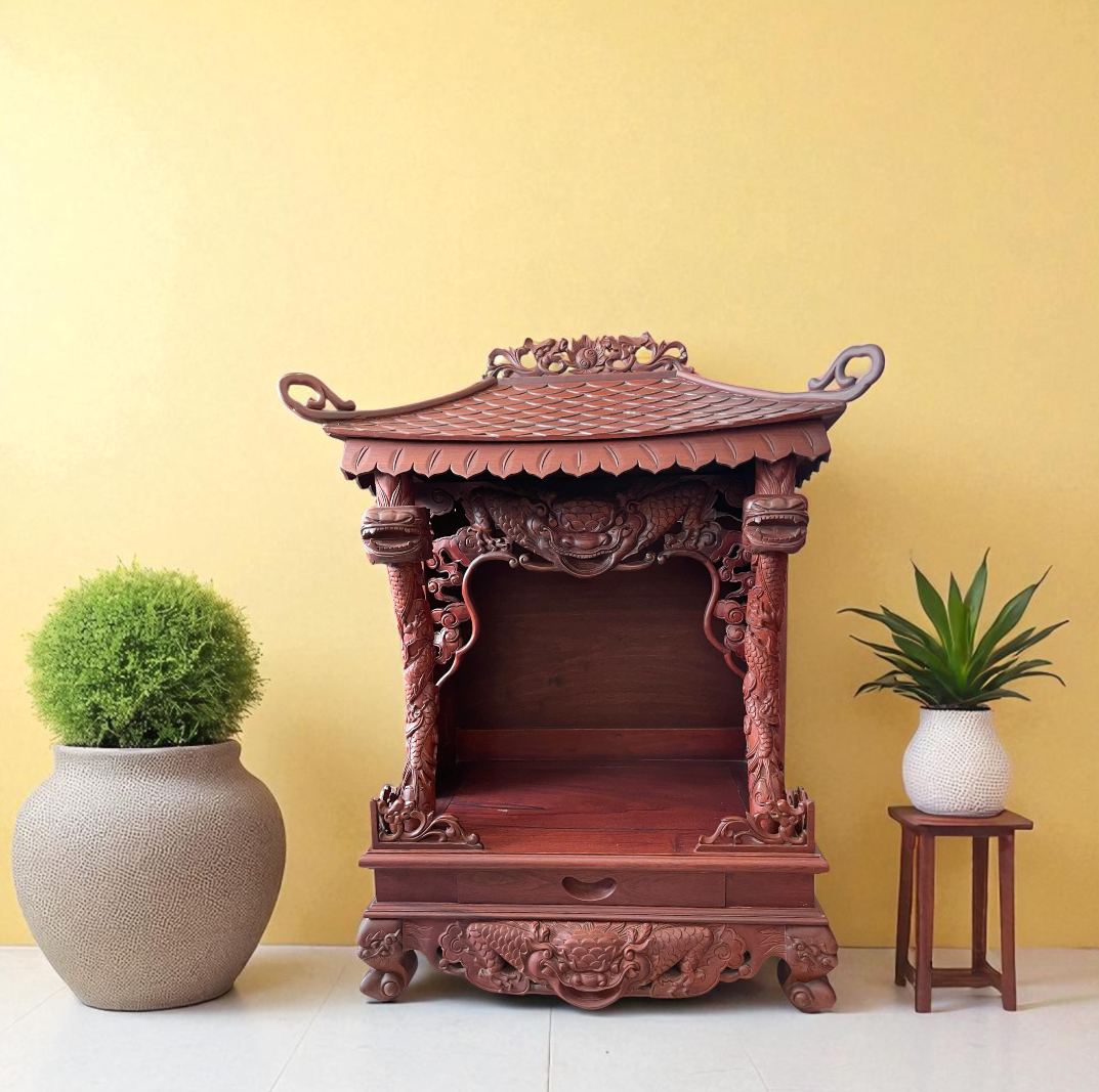 Mẫu trang thờ 62 rồng mái ngói được chế tác từ gỗ hương đá bền chắc, mang đến sự uy nghiêm và sang trọng cho không gian thờ tự.